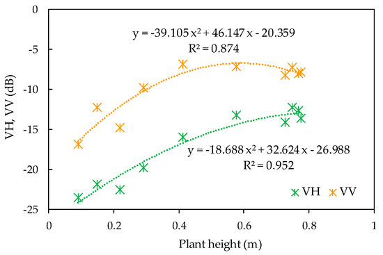 Backscattering coefficients as a function of plant height, expressed by polynomial regressions.