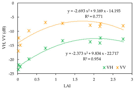 Backscattering coefficients as a function of LAI, expressed by polynomial regressions.