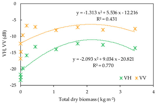 The relationship between VH or VV and the plant biophysical parameters, with single polynomial regression lines, is shown in Figure 9, Figure 10, Figure 11 and Figure 12. Our results from the polynomial regression agree with the results reported by Chakraborty et al. [19], where they studied rice crop biophysical parameters, that is, crop height, using SAR data obtained by Radarsat. They found that polynomial relationships are the most appropriate to link plant height and SAR backscattering coefficients. They obtained coefficients of determination between backscatter and plant height, where R2 = 0.694, 0.693, 0.527, and 0.947 for beam S-1, S-5, S-6, and S-7, respectively, while in our case, R2 = 0.952 and 0.874 for VH and VV, respectively (Figure 9). In a similar type of study, Le Toan et al. studied the relationship between backscatter and rice crop parameters, that is, plant height and biomass, using ERS-1 data [34], demonstrating a high-performance description by polynomial regression. R2 values shown in Figure 9, Figure 10, Figure 11 and Figure 12 indicate that VH is superior to VV. Compared with VV, VH backscattering coefficients have a much stronger relationship to all of the tested biophysical parameters, where plant height, green vegetation cover, and LAI versus VH had an R2 greater than 0.9 (Figure 9, Figure 10 and Figure 11). Compared with these three biophysical parameters, total dry biomass had a weaker relationship to backscattering coefficients (Figure 12). Total dry biomass is constantly low during the vegetative stage, but the backscattering coefficients change significantly during the period (Figure 7D and Figure 8). In the following reproductive and ripening stages, total dry biomass increases significantly, but the backscattering coefficients values are stable. Therefore, it is difficult to correlate the total dry biomass and backscattering coefficients.