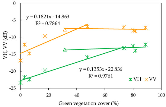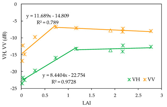Even though the polynomial regression reasonably expresses the relationship between backscattering coefficients and the biophysical parameters, except the total dry biomass, the polynomial approach has an operational inconvenience for rice crop monitoring by satellite SAR. The polynomial equation accepts two solutions for a specific backscattering coefficient value. For example, VH = −13 dB can either take LAI = 1.6 or 2.5 (Figure 11), which is inconvenient when estimating LAI by satellite-observed backscattering coefficients. As a unique attempt by this study, Figure 13, Figure 14, Figure 15 and Figure 16 show the relationship between VH or VV and plant biophysical parameters by a combination of two linear regression lines. The regression equations shown in the figures are for the linear regressions of the first periods, where the first period is defined in Figure 6. Data plot by triangles, appearing in Figure 14 and Figure 15, are the data for the last day of ground observation, where some reductions of green vegetation cover and LAI were confirmed by plant senescence (Figure 7B,C). Such data were treated as the data for second period.