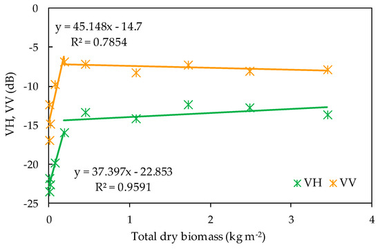 Backscattering coefficients as a function of total dry biomass, expressed by a combination of two linear regressions.
