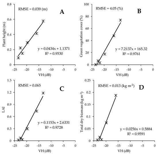 Plant biophysical parameters (A); plant height, (B); green vegetation cover, (C); leaf area index, (D); total dry biomass) expressed by VH backscattering coefficients for the first period before the turning point. RMSE, root mean square error.