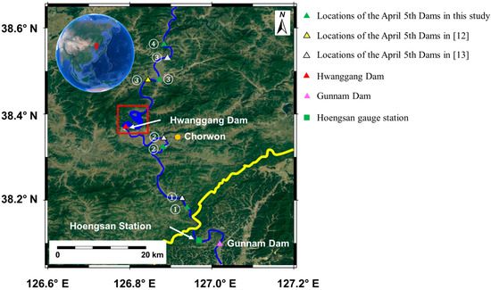 Firstly, the information about the dams, constructed upstream in the Imjin River, has been updated. Since the upstream region in the Imjin River is inaccessible, most of the previous papers have recorded inaccurate information about the dams in the Imjin River in North Korea. Here, we have investigated the current dams using multi-temporal images with high resolution obtained from Google Earth. Currently, the First April 5th Dam and the Hwanggang Dam still exist.