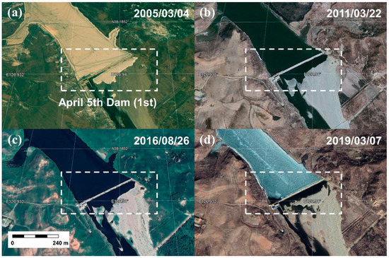 As previously mentioned, the inaccurate information of dams constructed upstream of the Imjin River has been found in many published papers [11,12,13,14,15,16]. As can be seen in Figure 1, the locations for the First, Second, and Third April 5th Dams were wrongly illustrated in [12,13]. Although Song et al. [11] showed the satellite images of the First and Second April 5th Dams, no information about the acquisition dates of the images was provided. Therefore, accurate and updated information about dams, constructed or destroyed upstream of the Imjin River, is required for water resources management in the transboundary river between North and South Korea.