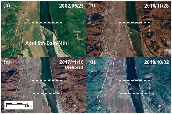 On the other hand, the information of dams, constructed or destroyed, has not been updated. To examine the current dams located upstream in the Imjin River, we checked the historical imagery of Google Earth, which provides multi-temporal images with high resolution [32,33]. We checked more than ten images obtained from different dates from 2002 to 2019. Figure 2, Figure 3, Figure 4, Figure 5 and Figure 6 show the selected images of the First, Second, Third, and Fourth April 5th Dams, and Hwanggang Dam, respectively. As confirmed in previous articles, the First and Second April 5th Dams can be seen in 2005 (Figure 2a) and 2002 (Figure 3a). Note that both dams were constructed in 2001 (estimated). However, the Second April 5th Dam cannot be found in 2013 (Figure 3c), and we can imagine that the dam could have been destroyed sometime between 2011 and 2013. In addition, as can be seen in Figure 4a and Figure 5a, the Third and Fourth April 5th Dams were identified in 2002. However, the Third and Fourth April 5th Dams cannot be found after 2011 and 2017, respectively. This implies that the two dams could have been destroyed before 2011 and 2017, respectively. In the case of the Hwanggang Dam, we can imagine that the dam still exists at present, as can be seen in Figure 6. This finding reveals the current dams that existed over the Imjin River in North Korea are the Hwanggang Dam and the First April 5th Dam, whereas most previous studies have claimed that the First, Second, Third, and Fourth April 5th Dams, and the Hwanggang Dam still exist.
