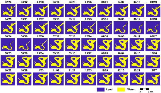 Recently, Pekel et al. [30] mapped global surface water and its long-term changes between 1984 and 2015 at 30-m resolution using three million Landsat satellite images. The dynamics of global surface water can be freely available with Global Surface Water Explorer (https://global-surface-water.appspot.com) from 1984 to 2018. In light of this tool, which maps the spatio-temporal distribution of global surface water, it is possible to navigate the water variability over the Imjin River near the Hwanggang Dam between 1984 and 2018. In this study, the aim of the use of this tool is to provide a general understanding of the water occurrence over the Hwanggang Reservoir. Therefore, we used an exploring function at https://global-surface-water.appspot.com/map. In the exploring function, we can navigate yearly water occurrence maps by turning on the “Earth Time-Lapse” layer. Detailed quantification and analyses of intra-annual water variations are provided in Section 3.3.