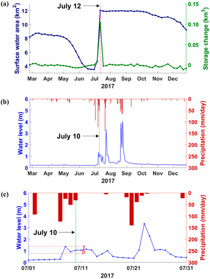 (a) Surface water areas and storage changes of the Hwanggang Reservoir in 2017, (b) daily mean water levels at the Hoengsan station and daily precipitation measurements obtained from CHIRPS in 2017, and (c) daily mean water levels at the Hoengsan station and daily precipitation measurements obtained from CHIRPS in July 2017. The purple line in Figure 12a indicates the date, 12 July 2017. The green lines in Figure 12b,c indicate the date, 10 July 2017. The red dots in Figure 12c represent sub-daily data based on YTN news on 11 July 2017 [54].