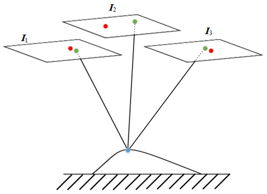 After the initial orientation correction in Section 2.3.2, we detect mismatches by checking whether their optical rays intersect at the same object space point, under the given orientation parameters. The intersections in the object space can be formulated as the re-projection errors in the image space. Therefore, we compute the ground coordinates of each match through the space intersection, then back-project these ground points onto all visible images and compute the re-projection errors of each feature point by measuring the distance between the original feature point and the projected points, as shown in Figure 3, where the blue circle is the ground object space point, the red circles on images are the multi-view matching points and the green circles are the re-projected points. Re-projection errors are formulated as the distance between the matching points and the re-projected points and the matching points with re-projection errors larger than a predefined threshold will be detected as mismatches. Since several satellite applications (e.g., digital surface model (DSM) generation) need at least 1-pixel level or even higher-accuracy bundle adjustment results and most feature matching algorithms are able to achieve 1-pixel level or even higher-accuracy matching points. Therefore, we set the threshold as 1 pixel, in order to guarantee the sub-pixel accuracy BA results. These mismatches are eliminated for a more accurate BA in Section 2.4.