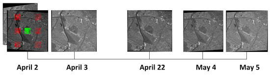 Our proposed method was tested on six WorldView-3 panchromatic images near San Fernando, Argentina from the intelligence advanced research projects activity (IARPA) Multi-View Stereo benchmark dataset [33]. The ground sampling distance (GSD) of these images was about 0.5 m and the imaging time of them was from April 2nd to May 5th, as shown in Figure 4. We evenly selected six 2000 × 2000 pixels tiles in the overlapping regions of all six satellite images for the multi-view matching, where SIFT descriptors [34] were utilized with the ratio between the first best match and the second best match as 0.8. We also applied SIFT matching with the ratio as 0.6 in the center of the overlapping regions for BA accuracy checking and eliminated the mismatches in these SIFT matches through a strategy of firstly RANSAC, then geometrically weighted BA. The remaining points in the center can be used as checking image points (CIPs). The distributions of both the matching points and the CIPs are shown in Figure 4.