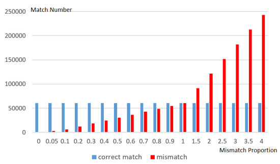 The matching point sets with different mismatch proportions. The vertical axis represents the match number in different point sets and the horizontal axis represents the mismatch proportions in the bundle-adjustment (BA) process.