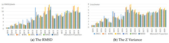 To test the reliability of all the seven matching confidence metrics in Section 2.2, especially when the mismatches are much more than the correct matches, this experiment compared their performances on all the matching point sets with the increasing mismatch proportions (from 0 to 4). For each matching point set, the seven-dimensional matching confidence vectors in Equation (8) are firstly computed for all the matches and then these matches were used in BA for orientation corrections. To test the sensitivity of these confidence metrics to the mismatches, the weights of each match in the BA only adopt the matching confidence itself instead of the geometric weights. Therefore, we totally computed seven BA results for the seven matching confidence metrics under the same matching point set and compared the reliability of these confidence metrics by assessing the re-projection error based RMSD and the z variances of CIPs. The RMSD and the z variance with the increasing mismatch proportions are shown in Figure 6.