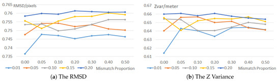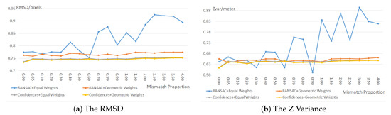 Then, we compared our proposed mismatch elimination method with the RANSAC strategy on all matching point sets with the mismatch proportions from 0.0 to 4.0 and computed the BA results with the equal weights and the inverse proportional model based geometric weights [6], respectively. The BA with equal weights aims at testing the residual mismatches after the elimination. More residual mismatches will lead to lower BA accuracy. The BA with inverse proportional model based geometric weights is to assess the performances of both methods in the traditional BA process. We also used CIPs to evaluate the accuracy of these BA results in the aspects of the re-projection error based RMSD and the z variances, as shown in Figure 8.