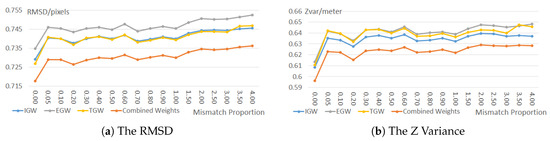 Figure 6 shows that the BA accuracy (the RMSD and the z variance) of all matching confidence metrics tend to be worse with the increasing proportions of mismatches. When no mismatches were available, all matching confidence metrics are able to achieve the sub-pixel level RMSD and the sub-meter level z variance. However, the BA accuracy decreased obviously with the increasing mismatches, since the matching confidence metrics often assign low, but still influential, weights to the mismatches. For example, the ZNCC metric often computes high weights (larger than 0.9) for the correct matches and low weights (smaller than 0.5) for the mismatches, while these low weights are far beyond the negligible levels (weights close to zero). The mismatches with these low weights still made significant contributions to the BA process, thus decreasing the BA accuracy. Therefore, the matching confidence metrics are not suitable for directly using alone as the weights, especially when large amounts of mismatches exist. However, such issue of matching confidences did not impact on our proposed method. In the matching confidence based mismatch elimination (Section 2.3), our proposed method only involves the highest-confidence matches instead of those low-confidence mismatches and in the bundle adjustment with combined weights (Section 2.4), our proposed method only uses correct matches, in which case the matching confidence based weights performed well.