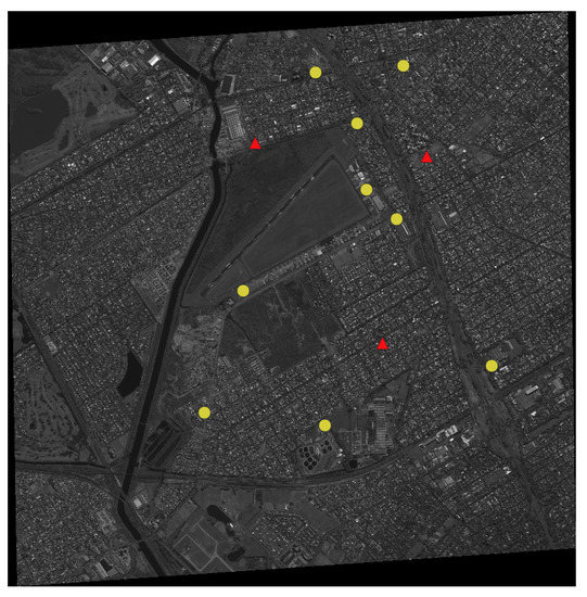 The distribution of 12 ground control points (GCPs). 3 GCPs marked with red triangles were applied in the BA process while other GCPs marked with yellow circles were used to check the accuracy of the BA result in the object space.