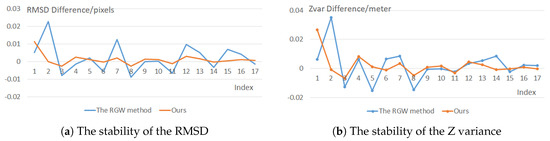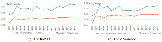 Similar to the first three experiments, we firstly compared both methods from the aspects of the re-projection error based RMSD and the z variance of CIPs, as shown in Figure 11. The comparison results show that our proposed method achieved higher accuracy than the state-of-the-art method (RGW), since our proposed method developed a more robust mismatch elimination strategy as well as a more accurate weighting strategy. Besides, to test the robustness of both methods with the increasing mismatches, the accuracy differences between any two adjacent mismatch proportions are plotted in Figure 12. Figure 12 shows that the accuracy difference distributions of our proposed method are flatter than the RGW method, which indicates better robustness of our proposed method in different mismatch proportions. The RGW method adopted RANSAC in mismatch elimination, which depends on the matching accuracy of the random samples. Therefore, the mismatch elimination results of RGW are unstable, even though in the same matching point set. Since our proposed method only selects the highest-confidence matches in the mismatch elimination, it can compute more robust BA results than the RGW methods.
