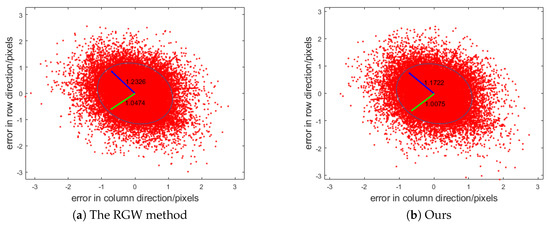 To give a better understanding of our proposed method, we also analyzed the 95% confidence eclipses of CIPs under the corrected orientations using the RGW method and our proposed method, respectively. Shorter major/minor axes of the confidence eclipse often represent higher BA accuracy. In general, we computed the confidence eclipses of both RGW method and our proposed method with increasing mismatch proportions and compared their bundle accuracy by computing the differences between the major axes and the minor axes, as shown in Figure 13 and Table 2. Figure 13 shows that both RGW and our proposed method achieved high-accuracy BA results with the major axes and the minor axes around one pixel, even though the mismatches were four times more than the correct matches. The major axes and the minor axes of our proposed method is shorter than RGW, which indicates that our proposed method computed higher-accuracy orientations of satellite images.