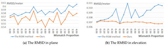 Figure 14 shows that both two methods can achieve high absolute accuracy on all matching point sets, while our proposed method always performed better than the RGW method in both plane and elevation directions, due to the more accurate mismatch elimination strategy and the more accurate weighting strategy in our method. The absolute accuracy of the RGW method tend to be worse with the increasing mismatches. However, the accuracy decreasing trend is not obvious in our method, which shows that our proposed method is more robust against the various proportions of mismatches. the RGW method follows a sequential workflow of firstly RANSAC and then bundle adjustment with the inverse proportional model based weighting strategy and our proposed method follows a sequential workflow of firstly matching confidence based mismatch eliminations and then bundle adjustment with the combined weighting strategy. Therefore, the main differences between the RGW method and our proposed method mainly focus on two aspects—(1) mismatch elimination strategies and (2) the weighting strategies. Different mismatch elimination strategies were compared in Section 3.2 using the same weighting strategies, which shows that our proposed mismatch elimination strategy achieved better matching accuracy than the RANSAC strategy. However, the BA accuracy of our proposed mismatch elimination strategy using the equal weights and the geometric weights were similar. On the other hand, different weighting strategies were compared in Section 3.3 after using our proposed mismatch elimination strategy, which shows that our proposed combined weighting strategy can further improve the BA accuracy, when compared with the BA results with only the geometric weights. Therefore, the accuracy improvement of our proposed method in Figure 14 is contributed by both the mismatch elimination strategy and the weighting strategy. In general, our proposed method not only achieved better BA accuracy in both the image space and the object space but also was more robust even though the mismatches were several times more than the correct matches, compared to the state-of-the-art method.