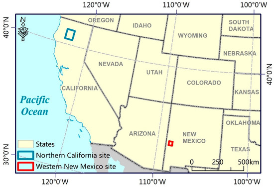 Study area map, where the blue box on the upper left is northern California forest and the red box on the bottom is western New Mexico forest site.
