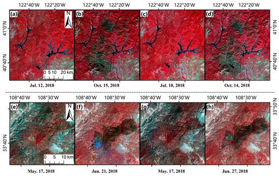 Satellite images visualized as false color composites (Near Infrared-Red-Green): (a) pre-fire Sentinel−2 image on July 12, 2018, (b) post-fire Sentinel−2 image on October 15, 2018, (c) pre-fire Landsat 8 image on July 10, 2018 and (d) post-fire Landsat 8 image on October 14, 2018 in northern California site; (e) pre-fire Sentinel−2 image on May 17, 2018, (f) post-fire Sentinel−2 image on June 21, 2018, (g) pre-fire Landsat 8 image on May 17, 2018 and (h) post-fire Landsat 8 image on June 27, 2018 in western New Mexico site. Burned areas tend to be black after fires.