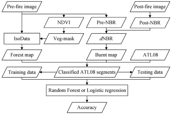 Flow chart of ATL08 segments classification procedures, where NDVI, NBR and dNBR are normalized difference vegetation index, normalized burn ratio index and differenced normalized burn ratio index.