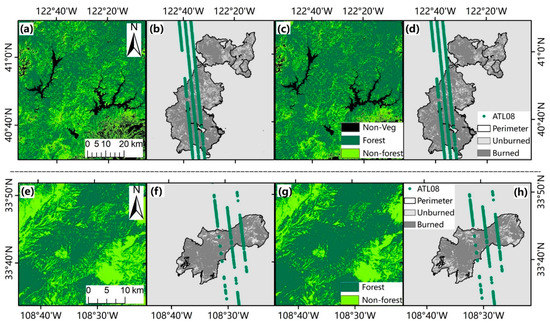 Classification maps: (a) Sentinel−2 forest map, (b) Sentinel−2 burn map, (c) Landsat 8 forest map, (d) Landsat 8 burn map in northern California site; (e) Sentinel−2 forest map, (f) Sentinel−2 burn map, (g) Landsat 8 forest map, (h) Landsat 8 burn map in western New Mexico site, where original ATL08 segments are labeled by the location of the center most photon and black polygons are fire perimeters. ATL08 data are discontinuous due to removal of segments with fill value.