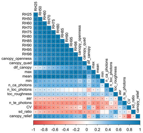 Figure 5 shows correlations of 24 LiDAR metrics of all Sentinel−2 derived samples in the northern California site and western New Mexico site. Basically, most metrics are significantly correlated with others, but the correlation coefficients vary greatly, which means metrics such as asr (apparent surface reflectance) and n_ca_photons (the number of canopy photons) still cannot replace each other. Moreover, most metrics are positively correlated with other metrics except asr, n_te_photons (the number of terrain photons), CV (coefficient of variation) and sd_ratio (standard deviation ratio). Canopy height related metrics such as RH25, RH50, RH60, RH70, RH75, RH80, RH85, RH90, RH95 and RH98 were highly correlated. However, metrics including dif_canopy (canopy difference to median height), min (minimum canopy height), n_ca_photons, n_toc_photons (the number of top of canopy photons), toc_roughness (top of canopy roughness), asr and n_te_photons have less correlation with other metrics, indicating splitting photon points into different types such as canopy photons, terrain photons and top of canopy photons provides extra information.