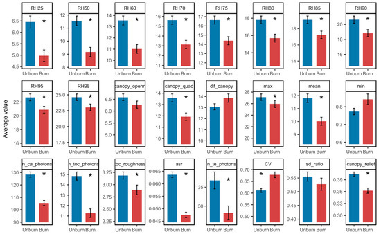 Figure 6 provides barplots of 24 metrics derived with Sentinel−2 forest maps and landcover maps from both study sites. Burned segments tend to have lower values than unburned segments except dif_canopy (canopy difference to median height), min (minimum canopy height) and CV (coefficient of variation). For example, average of n_ca_photons (the number of canopy photons) is 105 for burned segments which is lower than 128 of unburned segments. Moreover, the differences of average between burned segments and unburned segments are significant in most metrics except canopy_openness (canopy openness), dif_canopy, min and sd_ratio (standard deviation ratio). The average of CV is significantly increased after fire, which is due to different magnitude of change in mean and standard deviation of canopy height.