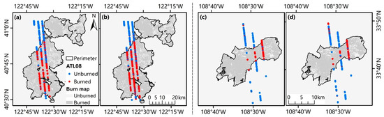 Random Forest classification of ATL08 forest segments (a) using Sentinel−2 derived samples and (b) Landsat 8 derived samples for northern California site; (c) using Sentinel−2 derived samples and (d) Landsat 8 derived samples for western New Mexico. Blue points are centermost photon of unburned segments and red for burned segments.