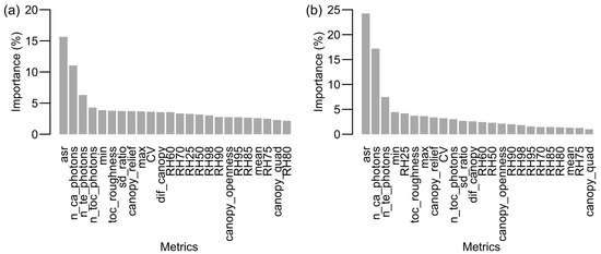 Based on Figure 8, asr (apparent surface reflectance) is the most important metric (15.65% and 24.25% in importance) in burned ATL08 segments classification, n_ca_photons (the number of canopy photons) ranking the second. Other metrics such as n_te_photons (the number of terrain photons), n_toc_photons (the number of top of canopy photons), toc_roughness (top of canopy roughness), RH60, canopy_relief (canopy relief ratio) and CV (coefficient of variation) are less important. It is reasonable that reflectance contributes to capturing vegetation characteristics and changes. In Zhao et al. [40], intensity related metrics in airborne LiDAR explained 60% of variations in leaf area index, which also illustrates the importance of reflectance.