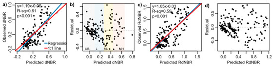 Relationship between (a) Random Forest predicted dNBR and observed dNBR; (b) residual to predicted dNBR; (c) predicted relative differenced normalized burn ratio index (RdNBR) to observed RdNBR; (d) residual to predicted RdNBR using testing samples derived from Sentinel−2 data. UB means unburned, L means low severity, ML means moderate low severity and MH means moderate high severity. Blue lines are regression lines and red lines are 1:1 lines.