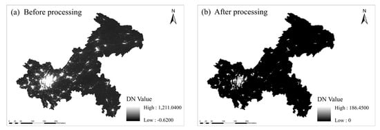First, Albers equal-area conic projection was performed on an NPP/VIIRS nighttime light remote sensing image, and the nighttime light remote sensing image of Chongqing was obtained with a spatial resolution of 0.7500 km. Since the NPP/VIIRS lighting data has not eliminated the effects of background values and combustion products, the radiance values have negative and maximum values. If used directly, it will have an impact on the research results, so these noises need to be processed. For selection of the minimum radiance value, we combined data with Google Earth, and selected several places where almost no night light as sample zones, such as forests, lakes, and high-altitude areas in the ecological reserve, then take the minimum value of them as the minimum value of the study area. Finally, the radiation value of pixels smaller than 2.5700 W⋅cm−2⋅sr−1 was assigned to zero []. In addition, for the extremely high value present in the image, that is, the abnormal maximum radiance value exceeding the most prosperous area in the study area, we selected the maximum radiance value of the surrounding 8 pixels as the radiance value of the pixel []. A comparison of before and after processing is shown in Figure 2.