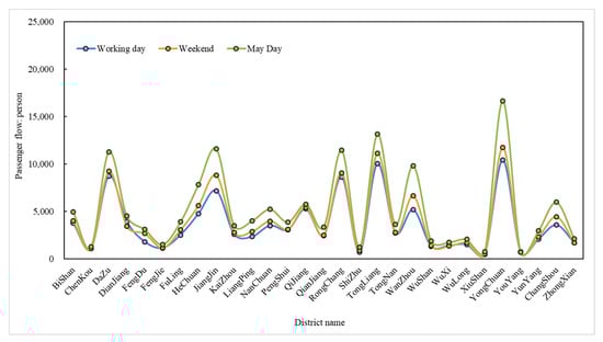Since space-time characteristics are among the most important features of passenger flow data [], this part is used to analyze the temporal and spatial distribution characteristics of road traffic. Due to the passenger flow in the main city of Chongqing being significantly higher than that in other districts, to make the results more clear, the main city is excluded from the result shown in Figure 3 (the corresponding passenger flow of the main city is 36,181 people, 45,462 people and 61,293 people for the working day, weekend and May Day, respectively). From Figure 3, we can see that with the increase of vacation time, the passenger flow of districts increases accordingly. In addition to the main city of Chongqing, Yongchuan has the most passenger flow in all three time periods. This finding may be observed because Yongchuan is located in the upper reaches of the Yangtze River in the west of Chongqing and adjacent to Sichuan Province. These geographical conditions cause it to not only have a good ecological environment but also have airports, port areas and a number of railways and highways. Convenient transportation and a suitable ecological environment make it more attractive.