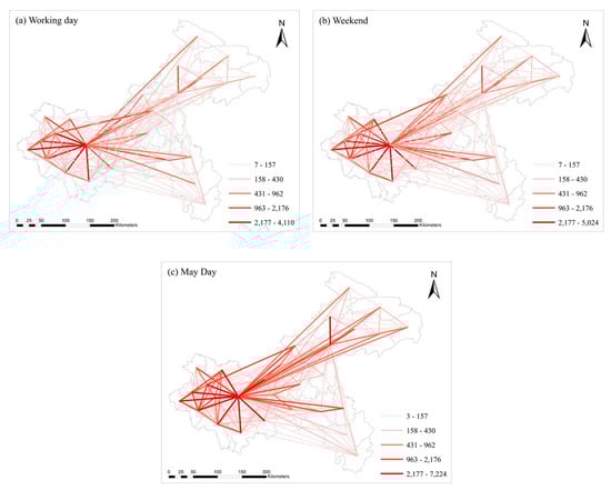Since the traffic volume of districts is closely related to the geographical location, researching the traffic volume of the districts should not only reveal the changing trends occurring in different time periods but also aid understanding of the spatial distribution pattern. In this instance, the natural discontinuity method is used to divide the passenger flow into five categories. To make the classification results comparable, based on the classification result of the working day, the passenger flow of the weekend and May Day is classified according to the same criteria. The classification results are shown in Figure 4, which indicates that the passenger flow during the working day, weekend and May Day shows a trend of decrease from west to east. Under the same classification conditions, the high-value areas of passenger flow are mainly distributed in the western districts of Chongqing, and the low-value areas are mainly distributed in the northeast districts and southeast districts. From the working day to the weekend to May Day, the number of districts entering high-value areas increases. With the increasing holiday time, the passenger flow of the “one-hour economic circle” districts have increased significantly, but the passenger flow in Bishan became relatively small. Wushan as the “Northeast Gateway of Chongqing” has increased passenger volume during May Day. One of the reasons is that Wushan is located in an important position in the Three Gorges Reservoir Area and has rich natural tourism resources and famous tourist attractions. Although it is far from the main city, during holidays is also very attractive to tourists. From the maximum passenger flow, it can be seen that the passenger flow in the main urban area has increased significantly, which has a strong relationship with social and economic status in Chongqing.