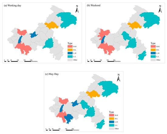 According to the actual distribution, H–H is mainly distributed in western Chongqing. L–L is mainly distributed in the northeast of Chongqing and the southeast of Chongqing. The distribution is related to the urban functional partition. Bishan is characterized by L–H during the study period, most likely because it is close to the main city and has convenient transportation, which causes more people to choose to drive or take railway transportation. This situation leads to a decrease in passenger flow on the road, making the passenger flow in the surrounding districts higher than that in Bishan. During the period of study, Wanzhou is shown as H–L, perhaps because it is located in the hinterland of the Three Gorges Reservoir Area and is the central city and material distribution center of the Yangtze River in Chengdu and Chongqing, so the population flow is larger than that in the surrounding areas. Xiushan is characterized by L–L on weekend and May Day. Perhaps it is located at the junction of Chongqing, Guizhou and Hunan provinces. During non-working days, the connection between Xiushan and neighboring provinces weakens the connection with Chongqing districts.