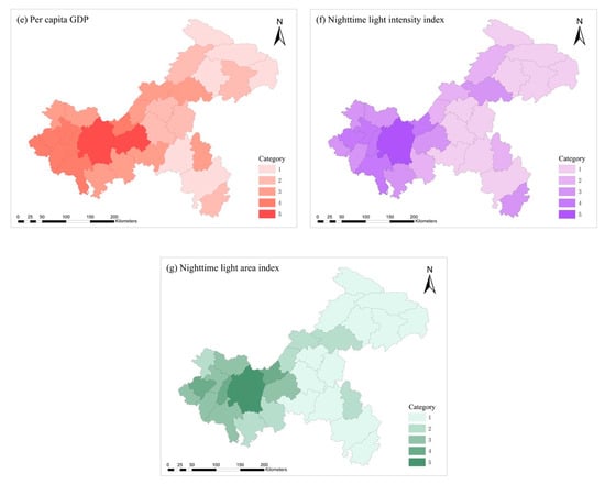 In this section, each variable is divided into five categories using natural discontinuity, which will be assigned values from 1 to 5. Assuming that the resident population of a certain district belongs to level 1, it indicates that the resident population of the district is lower than that of other districts. The spatial distribution of independent variables is shown in Figure 7.