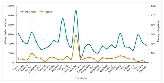 The change in spatial pattern is the concrete manifestation of the driving factors behind it. When detecting the influence of each impact factor on the spatial differentiation characteristics of highway passenger traffic, it is found that the nighttime light area index (0.9251, 0.9512, 0.9541) has the strongest explanatory power for the spatial differentiation of highway passenger flow among the factor detection results, which may be because the nighttime light data can be easily obtained as an objective data source, is well-recognized for weak light sources generated by human activities and can indirectly reflect the range of human activities and the degree of urbanization. However, the per capita GDP (0.4704, 0.4771, 0.4751) and highway mileage (0.2375, 0.2369, 0.2347) have weak explanatory power for the spatial differentiation of passenger traffic. The per capita GDP has weak explanatory power on passenger flow, which may be due to its strong subjectivity as a macroeconomic factor and its weak sensitivity to the change of passenger flow in a short time. Thus, it is difficult to accurately describe the distribution of passenger traffic. In addition, the per capita GDP can reflect the quality of life in the region. With the improvement of the quality of life of residents, other alternative modes of transportation, such as private cars, aviation, railways and so on, have emerged to reduce their impact on road passenger flow. Because the mileages of freeway and other road types are both included in highway mileage, the two types of roads are divided to explore the reason why the highway mileage has the weakest explanatory power on passenger flow. Road mileages of different types in Chongqing (Figure 10) show that the mileage of other roads in districts is significantly more than the mileage of freeway. The factor detector is used to explore the explanatory power of freeway and other roads to passenger flow. The result of factor detector shows that the explanatory power of other roads is 0.3840, 0.4048 and 0.3997, respectively. But the explanatory power of freeway is 0.8234, 0.8616 and 0.8730, respectively. This indicates that freeway mileage may better explain the spatial differentiation of passenger traffic compared to other roads mileage []. Chongqing has complex terrain and large differences in altitude, which makes population, economy, and policy mostly concentrated in relatively flat areas []. And the construction of the freeway is inseparable from these conditions. These conditions, in turn, will increase the flow of passengers in districts.