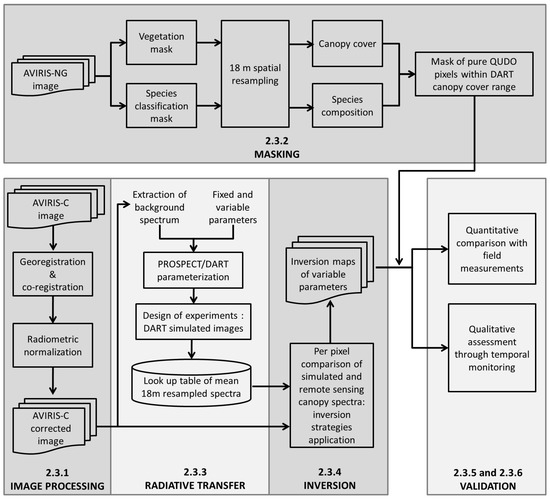 The objective was to create a monospecific mask of QUDO. The final monospecific mask was obtained by (i) eliminating the areas with too many PISA in the images, (ii) eliminating pixels with too low tree presence (CC < 10%) and (iii) removing the pixels containing water, roads, and manmade infrastructures. The AVIRIS-NG image at 2 m spatial resolution was processed to derive a 18 m CC map as well as a species composition map. Figure 3 gives an overview of the processing steps done over the AVIRIS-NG image.