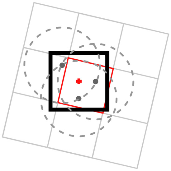 Concerning LAI, each validation point was the average of LAI values derived from 3 hemispherical pictures taken within a 20 × 20 m plot (see Section 2.2.1). Therefore, one LAI validation point does not necessarily only contain information about the LAI of the AVIRIS-C pixel it is associated with. Figure 4 illustrates the issue: Since the AVIRIS pixels and the grid used for DHP acquisitions have no reason to match, some DHP (dots) may have been acquired out of the pixel the final LAI has been associated with (red square). Direct comparison between pixel-estimated value and validation data can therefore be inappropriate, especially for spatially heterogeneous canopies. To address this, LAI validation points were compared to a spatially smoothed LAI inversion map. The spatial smoothing was done by computing the average LAI within a sliding window with an aperture size of 3 pixels. The aperture size was set to 3 as the LAI validation plot size (20 × 20 m) roughly matches the AVIRIS-C pixel size (18 × 18 m) (Figure 4).
