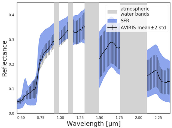 The assessment of LUT reflectances acceptability with regard to those measured by AVIRIS-C was done in two steps. First, DART-simulated reflectances of each LUT were plotted and compared to the reflectances measured by AVIRIS-C at the associated date (see, for example, Figure 5). All LUTs consistently overestimated canopy reflectances between 0.75 and 1.1 m, with the mean image reflectance being either barely within or below LUT reflectances near the red-edge. Image reflectances in the visible and SWIR regions were, however, within simulation ranges.