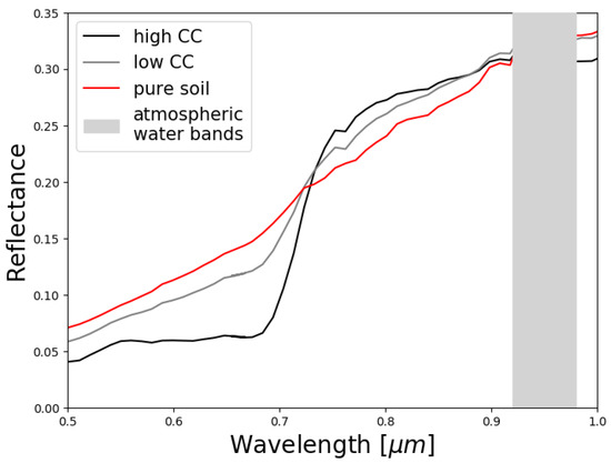 Once the LUT was built, it was also necessary to assess the suitability of each VI to serve as a criterion for LAI and biochemistry estimations when using the LUT entries. Indeed, it is clear that the green vegetation signal is quite low. The reflectance of low CC pixels is close to that of pure ground, with only a slight red-edge increase (Figure 6). Even at high CC, the red-edge is not very steep, and the chlorophylls reflectance peak at 0.55 m is barely visible: It could be possible that some VIs would not be able to detect some of the variations of the variables of interest.