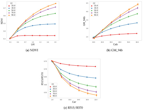 It was found that the indices selected for LAI estimations all started saturating at 0.4 m2/m2 LAI for the 10% of CC cases (Figure 7a, red line). This behavior was not found for higher CC. Since the 10% CC category could only bring confusion due to this saturation when estimating LAI, it was decided to remove these cases from the LUT. Excluding these cases could also be done based on their lack of realism, as low CC–high LAI canopies are unrealistic. Vegetation indices dedicated to C and Car estimation did not show such behavior (Figure 7b,c); therefore, all CC cases were considered during the inversion step for C and Car.