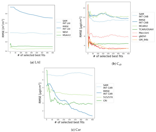 C results showed a similar plateauing behavior (see Table 7 and Figure 8b). Therefore, it was decided to proceed the same way as the LAI and to consider the 300 best performing solutions for C estimations, since the RMSE plateau was always reached at this point. The lowest RMSE for summer 2013 was obtained with TCARI/OSAVI (5.86 µg/cm2). The lowest RMSEs for fall 2013 and summer 2014 were obtained with gNDVI (3.86 g/cm) and GM_94b (2.89 g/cm), respectively. MCARI2 performed very poorly for all dates, even more so than the RMSE and SAM criteria that at least showed acceptable performances for summer 2014.