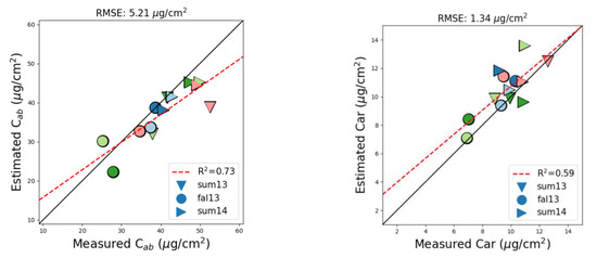 A factor that could explain some estimation errors (and specifically the underestimation of the Cab summer 2013 pink point) is the assumption that the biochemistry measured on one tree can be considered representative of (i) the biochemistry of leaves that are sensed by AVIRIS-C (i.e., mostly top of canopy leaves) and (ii) the leaf biochemical content of all the trees within a pixel. While to address (i), attention was given to only collecting leaves on the sunlit part of the crown (see Section 2.2.2), it is not possible to confirm (ii) with the available field data, and a leap of faith must be made. There is therefore always an uncertainty concerning how representative validation data are with regards to their associated pixels.