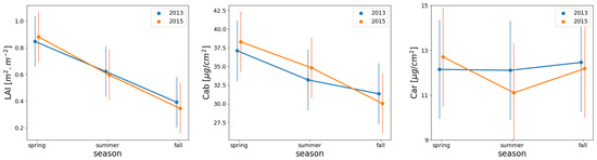 To provide a qualitative validation of LAI and pigment estimations, estimations using the best inversion strategies (Section 3.3.2 and Section 3.3.3) were computed, and seasonal variations were monitored and compared to expected variations. The seasonal monitoring involved LAI and foliar C and Car. Estimation maps were built using AVIRIS-C acquisitions done in the spring (DOY 122 and 119), summer (DOY 155 and 159), and fall (DOY 262 and 286) of 2013 and 2015. Each estimation’s uncertainty is the STDB of the variables’ estimations (STDB are presented in Section 3.3.2 and Section 3.3.3). Changes in the site’s mean LAI and foliar C and Car were considered significant if they were greater than the STDB of their respective variables.