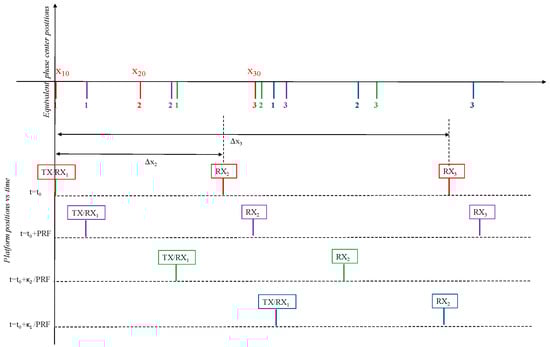 The spacing among the receivers is not uniform, though it is not very irregular as expected in an FF-SAR spaceborne mission. In detail, the transmitter platform is also receiving, hence Tx and Rx1 positions coincide, whereas the receivers 2 and 3 are dislocated. In Figure 1, different time instants have been shown. The first is after 1/PRF from t0. Indeed, a distance of vs/PRF exists between sample 1 at t0 (shown in red) and the one gathered after 1/PRF (shown in violet). The second time instant (t = t0 + κ2/PRF) is when sample 2 is between x30 and sample 3 gathered after 1/PRF (sample 3 in violet). Similarly, the third time (t = t0+ κ1/PRF) is when sample 1 is between x30 and sample 3 gathered after 1/PRF (sample 3 in violet).
