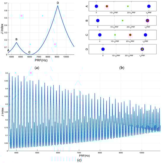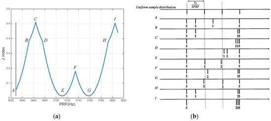 Assuming the parameters of Table 1, the trend of J as a function of PRF is presented in Figure 2a. Specifically, PRF is increased up to 5% of the nominal value of 3628.4 Hz. J achieves both maxima and minima within the simulated range of PRF. Figure 2b shows the distribution of samples corresponding to some remarkable points along the curve of the index J. Starting from the first point A, both sample 2 and sample 1 drift leftward so the level of nonuniformity increases. J-index increases as well. When sample 2 reaches sample 3, the condition of point B is obtained. From this case, J-index continues to increase with the increasing PRF, up to the condition in which both 2 and 1 are very close to 3, thus representing a local maximum for J. If PRF is further increased, J decreases because 1 and 2 drift leftwards but with different drifting rates with respect to PRF. The result is that samples tend to become more and more uniform, up to the condition of a local minimum of J in which sample 1 is at one-third of the distance of vs/PRF from the left sample 3 and sample 2 is very close to a distance of one-third of vs/PRF from the right sample 3 (this corresponds to point E in Figure 2b). In this case, samples are very close to the condition of uniform distribution. Any PRF increase from this condition leads to an increase of J-index, which reaches a local maximum (point F) when sample 1 is overlapped to sample 3. Finally, the behavior of points G, H, and I can be explained using a similar argument as for points E, B, and C, respectively. In conclusion, based on the presented analysis, the best PRF should be selected as that corresponding to point E or to point G. Specifically, from the point of view of spatial sampling, those points are very similar.