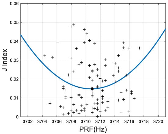 Analysis of J-index as a function of PRF with typical relative position errors. Zoomed view around the point E of Figure 2.