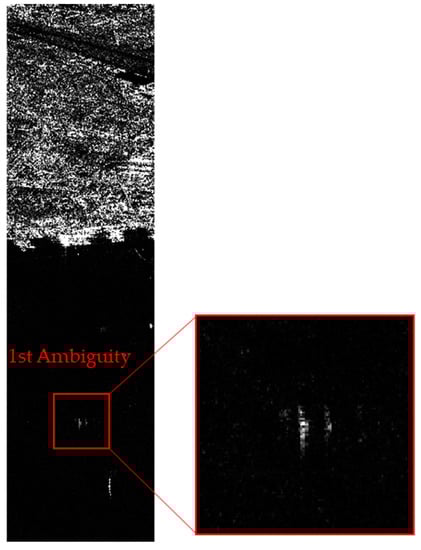 where and rE is the local Earth radius. Since herein the first ambiguity is only of interest, the location of the first forward and backward ambiguities can be computed with m equal, respectively, to −1 and 1 in Equation (9). More details about the computation of the location of the azimuth ambiguities are available in Appendix A. The algorithm can be easily generalized to accommodate more accurate models of the Earth surface.