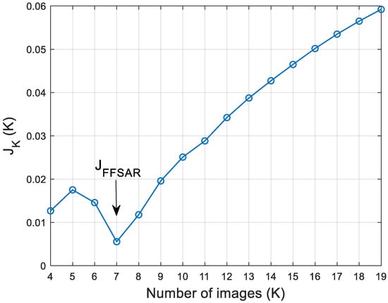 As explained in Section 2, the goal is to select the best combination of K satellite passes for each value of K (i.e., the K images leading to the most uniform distribution of samples). Hence, the trend of J as a function of K is analyzed: Equation (8) is used to compute the J-index for each combination of K platforms and the minimum value is stored and plotted as according to the following equation: