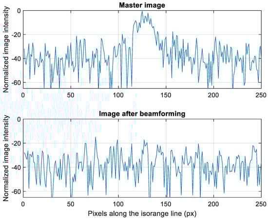 The maximum degree of uniformity for the collected samples was obtained for K = 7. This means that, with reference to the PRF of the data stack, 7 out of 20 available images led to the most uniform distribution of samples. The beamforming algorithm of Section 3 was then applied to this case. It is clear that, because of decorrelation among the images collected in a repeat-pass fashion, the overall image quality of the computed final image was very low. So, to make the results less affected by time decorrelation, the analysis of the final image was limited to the high SNR, and stable azimuth ambiguity of Figure 6 and the relevant ground target. To appreciate the effect of the beamforming process, Figure 8 shows the signal intensity (in dB) along the iso-range line of the ground target generating the ambiguity. The strong reduction of the ambiguous signal after beamforming is evident. In order to quantify such an effect, the azimuth ambiguity-to-signal ratio (AASR) was evaluated. The AASR can be computed as